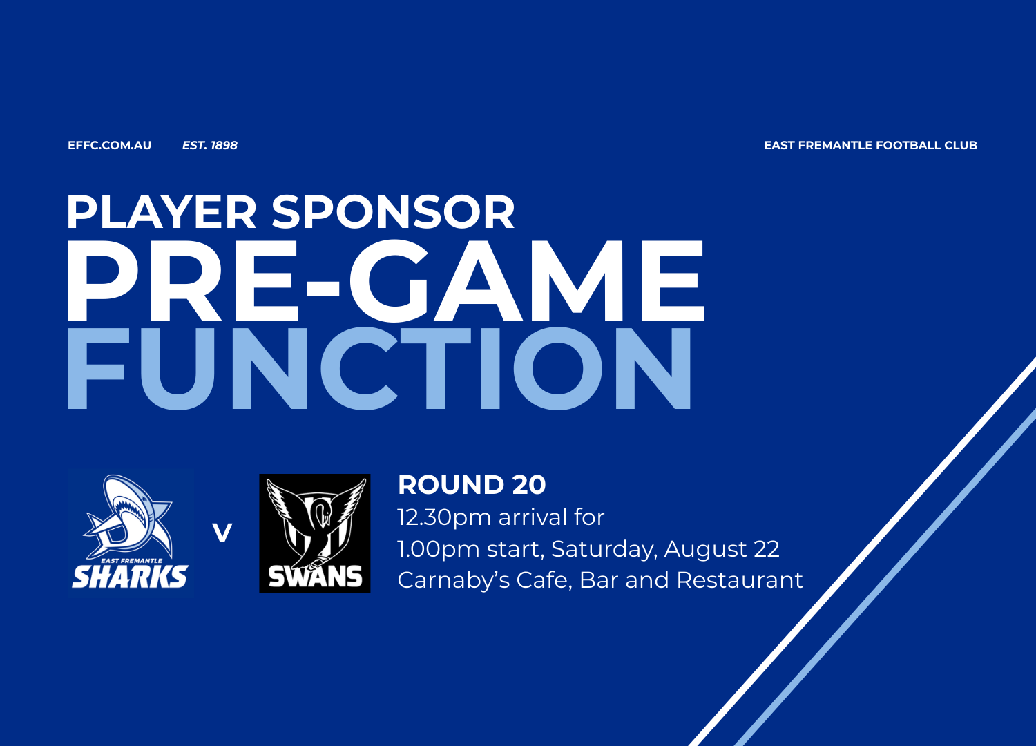 Join the East Fremantle Football Club for our President’s Cocktail Function as we acknowledge the club’s mens Player Sponsors ahead of our Round 20 clash against Swan Districts.